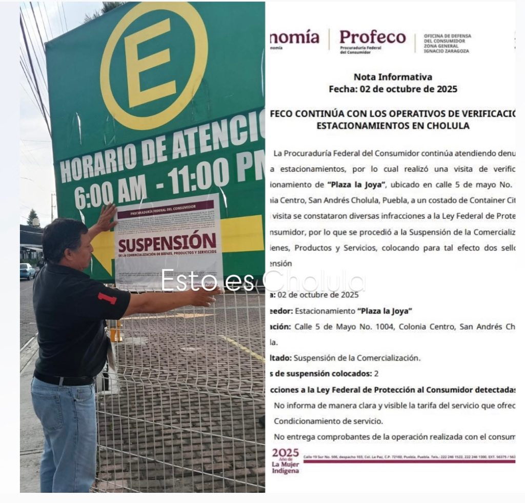 La ProcuradurÃa Federal del Consumidor (Profeco) llevó a cabo un operativo de verificación en el estacionamiento de Plaza La Joya, ubicado en la calle 5 de Mayo #1004, colonia Centro de San Andrés Cholula, a un costado de Container City.