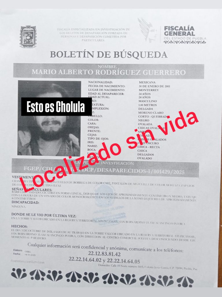 La última vez que se le vio con vida fue el pasado 3 de octubre, al salir de su trabajo en la torre Valcor, ubicada en la Reserva Territorial Atlixcáyotl, en San Bernardino Tlaxcalancingo.